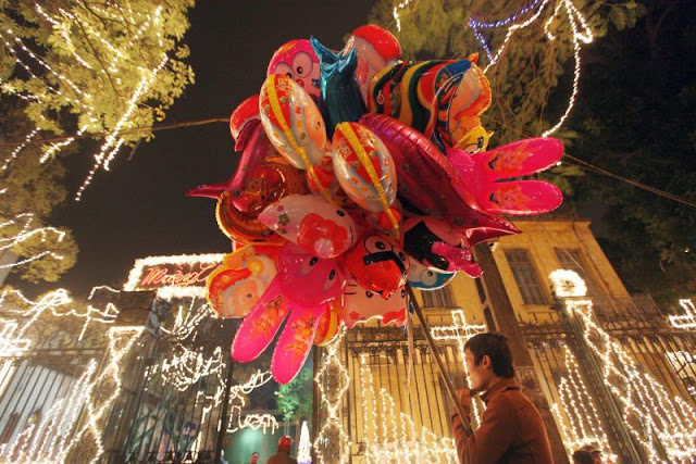Ολοένα πιο δημοφιλής γίνεται στο Βιετνάμ η γιορτή των Χριστουγέννων, ενώ τα τελευταία χρόνια, η ημέρα έχει καθιερωθεί ως επίσημη αργία. Όλο και περισσότεροι πολίτες φορούν στολές του Άι-Βασίλη και στολίζουν χριστουγεννιάτικα δέντρα. Ένας πωλητής ετοιμάζεται να πουλήσει τα μπαλόνια του έξω από ένα φωταγωγημένο κτίριο.
